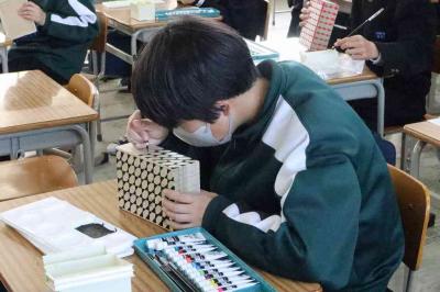 【1年生美術科】「はがき箱のデザイン」をしていました。木箱にデザインして、色を丁寧に塗っています。細かい作業を一生懸命行っていました。