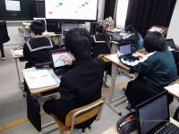 日本の音階を使って短い旋律を作る授業で、一人一台のタブレット端末を使って、個性豊かな曲を作っていました。