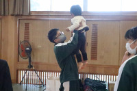 緊張してなかなか触れ合うことができない生徒もいましたが、保護者やお手伝いに来ていただいている方が優しくエスコートをしていただき、抱っこしたりおもちゃで一緒に遊んだりしました。短い時間でしたが楽しく活動することができました。