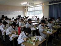 準備ができれば、いよいよ食事です。食べきれない人は、食事の前に減らしてもらい、食べれれる生徒に注ぎ分けて残食が少なるようどのクラスも工夫しています。