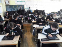 昨年度と同様に、タブレット端末を使って、解答していきました。教科によっては動画もあり、イヤホンで聞きながら、時間いっぱい問題を解いていました。