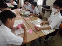2年生は学年集会で村上先生の話を聞いた後、1秒の言葉について学級で話合いをしました。日々の生活でどのような言葉を使うべきか考えました。